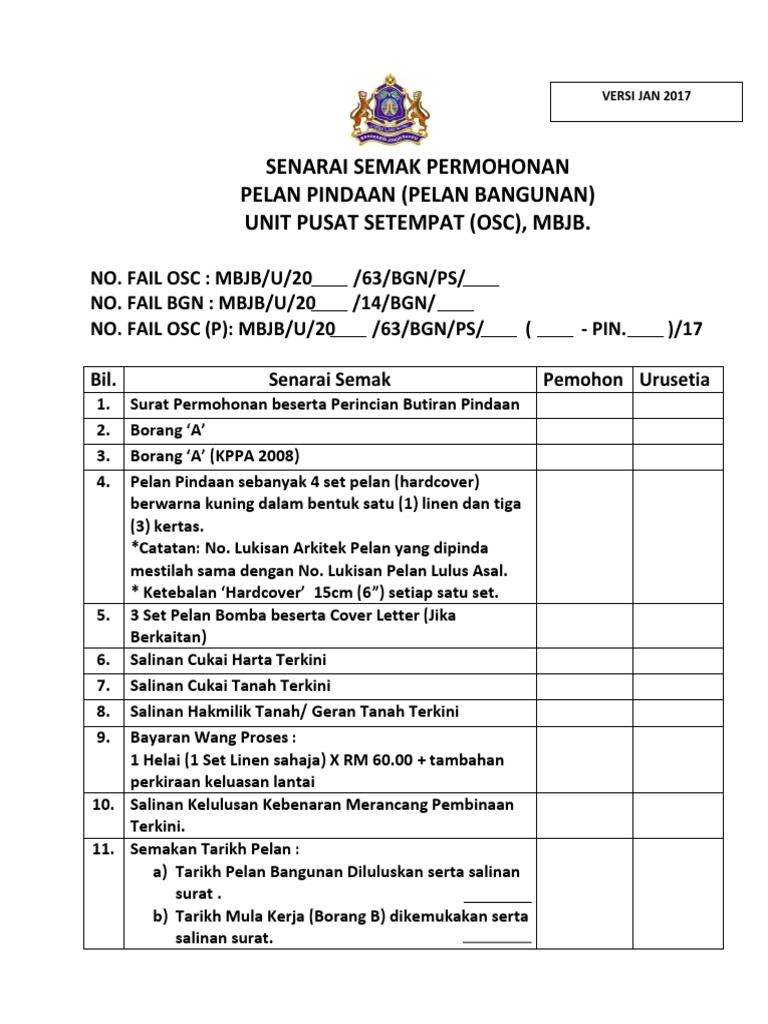 Senarai Semak Permohonan Pelan Pindaan Pelan Bangunan Mbjb Pdf